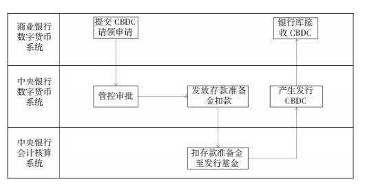 发行过程如下图所示,商业银行数字货币系统向中央银行数字货币系统发起请领申请,中央银行数字货币系统首先进行管控审批,该步骤为中央银行实施监管预留扩展功能。之后,向中央银行会计核算系统发起存款准备金扣款指令,中央银行会计核算系统扣减该商业银行存款准备金并等额增加数字货币发行基金。
