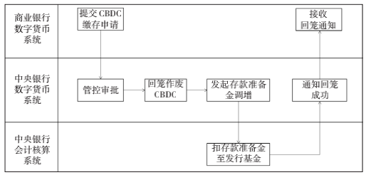 在发行阶段,扣减商业银行存款准备金,等额发行 CBDC。在回笼阶段,作废 CBDC 后,等额增加商业银行存款准备金。因涉及存款准备金变动,原型系统通过对接中央银行会计核算数据集中系统( 简称中央银行会计核算系统 ) 来实现。